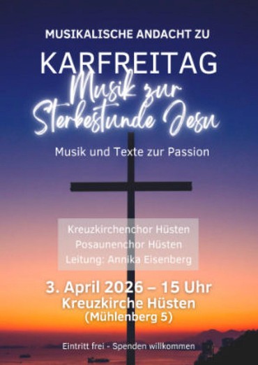 Die Evangelische Kirchengemeinde Hüsten lädt ein, am Karfreitag, dem 3. April, um 15 Uhr in der Kreuzkirche das Passionsgeschehen musikalisch zu erleben und zu begleiten.